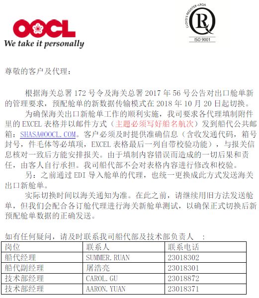 At present, the major shipping companies have issued emergency notices. Please be careful and tell each other. In order to ensure that the manifest prepared by the customs can be sent to the customs in time, please provide the complete manifest information in advance, otherwise it may be impossible to get on board and clear customs in time.