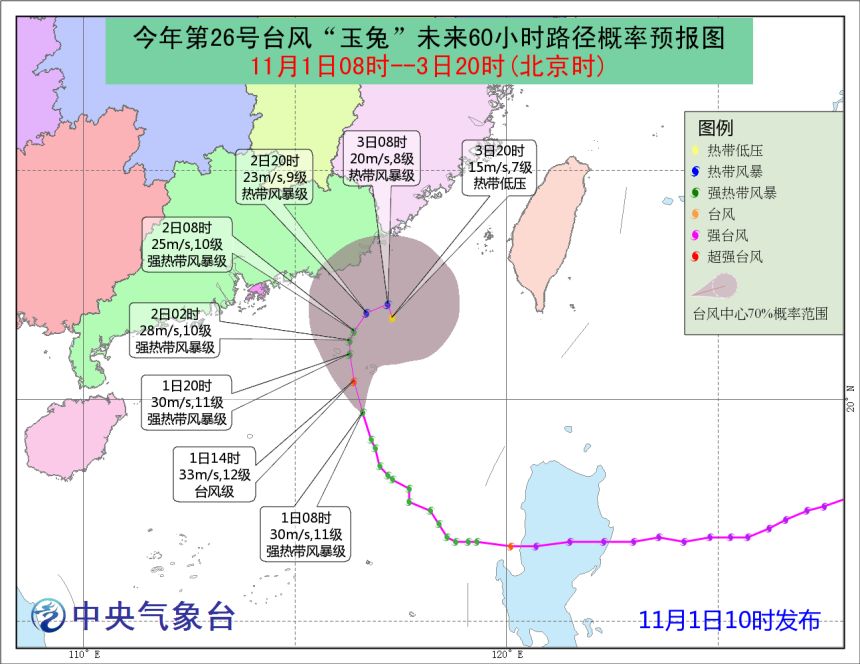 Influenced by " Jade Rabbit" and cold air, there will be winds of magnitude 9 - 10 and gusts of magnitude 11 - 12 in the Taiwan Strait, the Fujian coast, the eastern coast of Guangdong and the northeast of the South China Sea from 14: 00 on November 1 to 14: 00 on November 2.