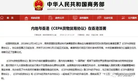 With the approval of the State Council, on the morning of December 14, 2018, the International Trade Negotiator and Deputy Minister of Commerce Fu Ziying and Hong Kong Financial Secretary Chen Maobo signed the CEPA Agreement on Trade in Goods in Hong Kong. From January 1, 2019, imports of goods originating in Hong Kong into the Mainland will fully enjoy zero tariff.